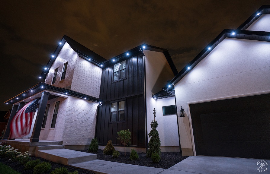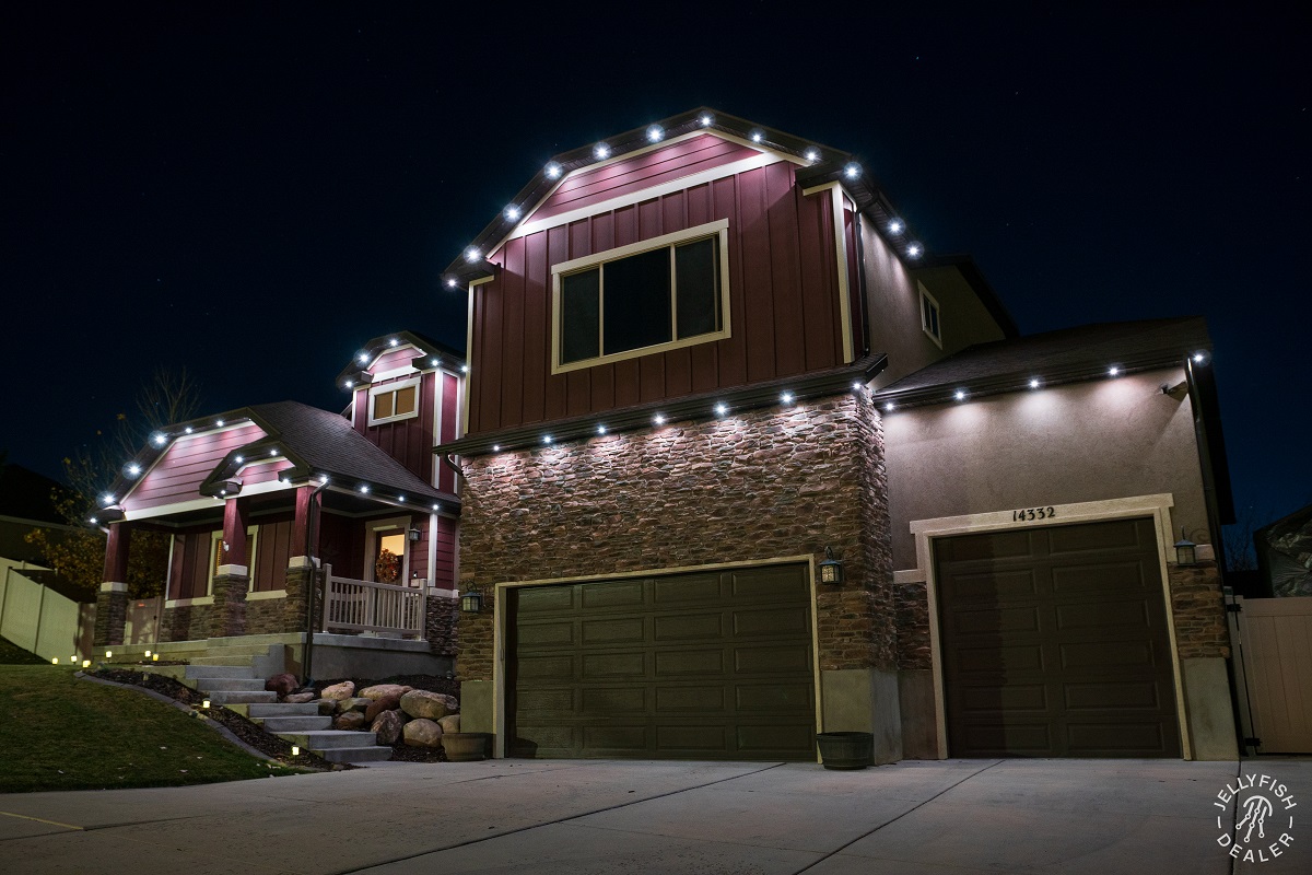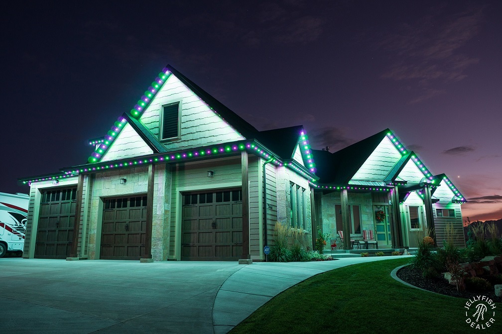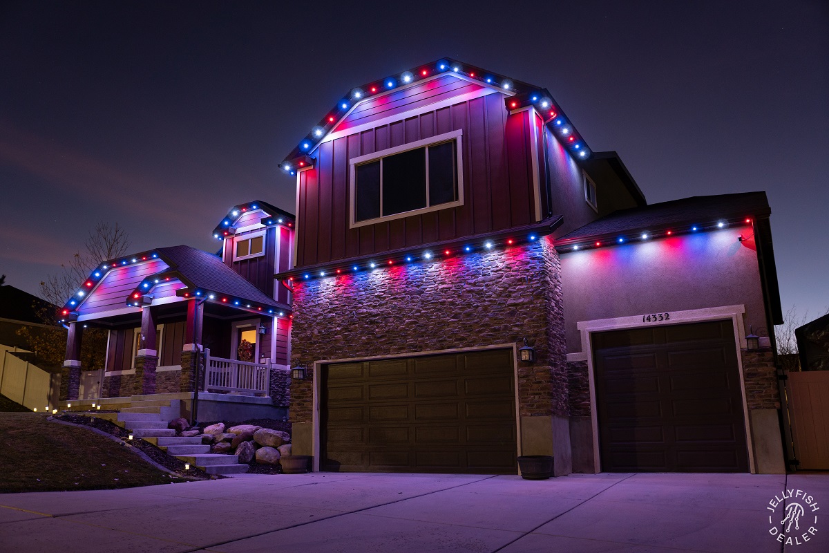 JellyFish Lighting is an advanced, permanent LED track and landscape system that seamlessly blends into your eaves and exterior architecture, offering vivid, color-changing effects and beautiful whites. With individually addressable LEDs and a powerful app, you can design your own patterns, set daily and weekly timers, and schedule calendar‑based events for holidays, gameday, and more.
